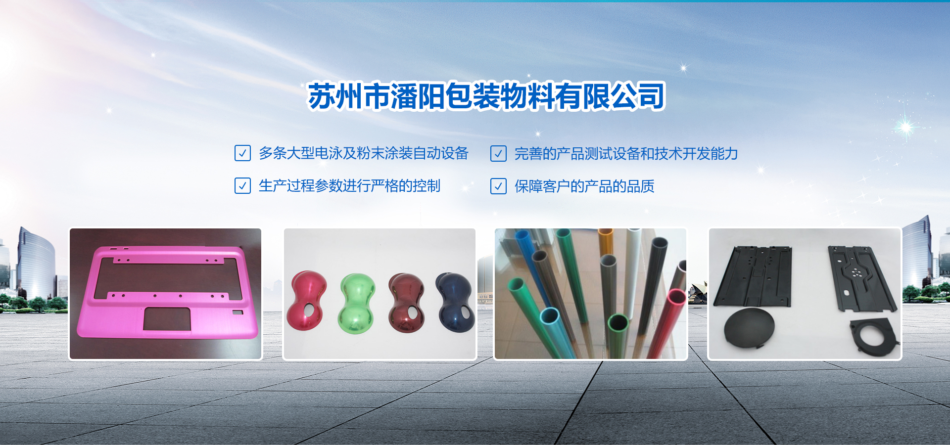 蘇州市潘陽包裝物料有限公司創建于2002年4月。坐落于美麗的蘇州相城。占地面積8000㎡,目前公司人員約150人,技術及管理人員約30余人。 專業從事彩色、黑色粉末涂裝及電泳等表面處理加工服務。公司現有多條大型電泳及粉末涂裝自動設備,并有完善的產品測試設備和技術開發能力,對生產過程參數進行嚴格的控制,從而保障了客戶的產品的品質。公司已通過TS16949、ISO14000體系認證,已經與亞太和歐美地區的廣大客戶建立緊密的業務合作關系。